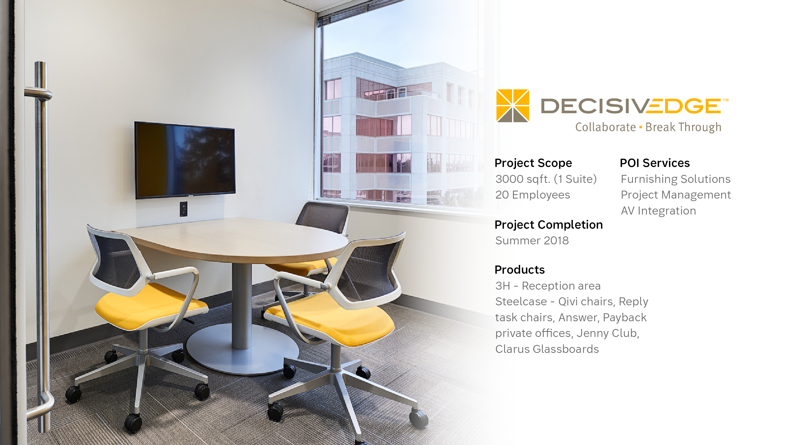When U.S based DecisivEdge expanded into Canada, they chose to use Steelcase product in line with their global standards. Looking to create a fresh, fun and contemporary space that would both attract and retain future employees, they approached POI. POI assisted DecisivEdge in further scoping their objectives which included optimizing real estate while creating a warm and welcoming environment.