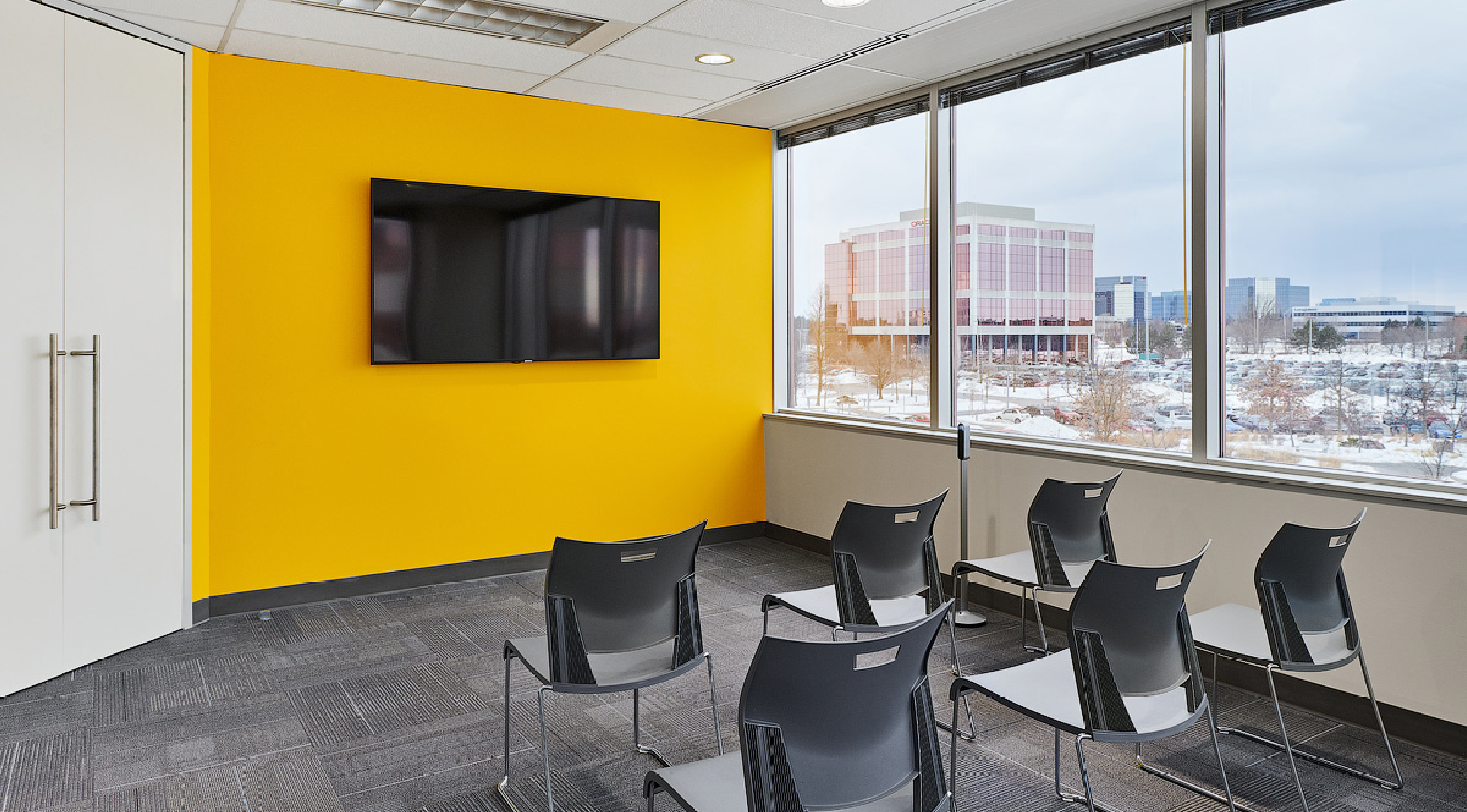 The solution included providing workstations, a reception area, an adjacent interview room, a training room, 2 private offices and 2 meeting spaces. POI also helped coordinate the creation of servery space, and an IT communications room. POI AV specialists integrated table power, screens and Connectrac under carpet wireways to ensure that the space not only looked sharp but was technology ready.