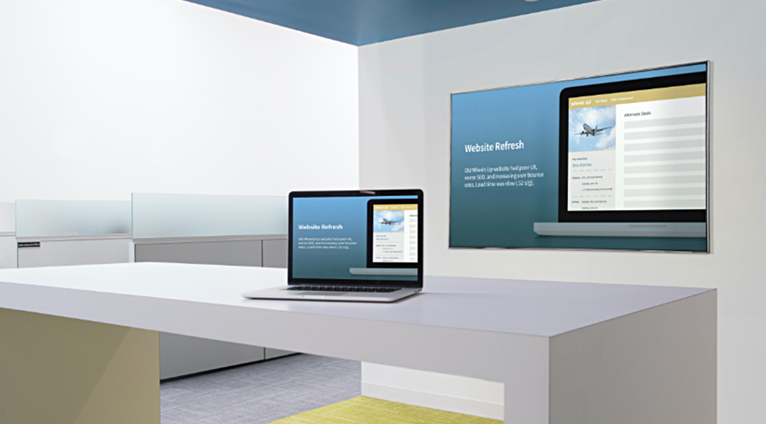 Touch-free room sensor automation turns on the technology in the room when you enter the space. The flat panel display provides information about the meeting and important health and safety information. Then start a wireless presentation from your laptop or mobile device to the screen in the room.