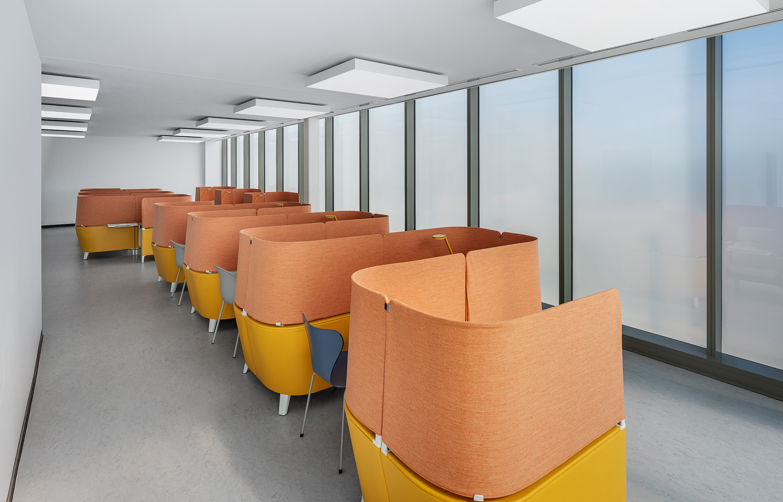A key challenge was the building’s extensive windows, which left little wall space for traditional media displays. To address this, a solution was developed where technology was embedded directly into furniture, making reconfiguration effortless while maintaining an open and adaptable space. The use of the Verb active media system provided a way to incorporate TV panels into learning environments without reliance on walls, allowing classrooms to function dynamically. For quiet study, dedicated alcoves and study lounges with varied seating options created spaces for both individual and group work.