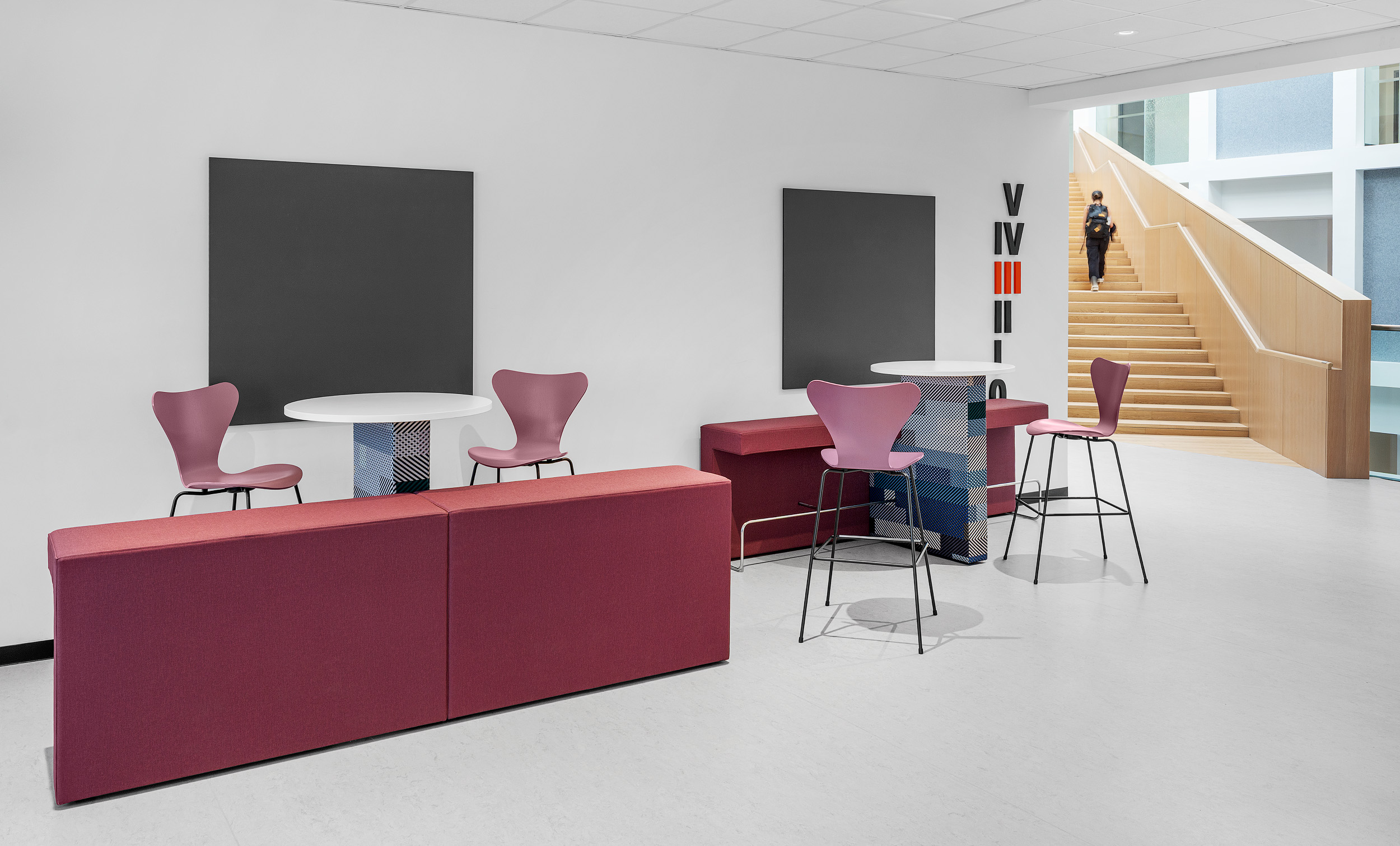 Multi-functional surfaces, such as Border , optimized narrow spaces, offering students the ability to work while also engaging with peers. A standout element of the project was the introduction of Tenor, a stackable seating solution with a flexible back that is made to move and features an intuitive bag hook, marking the first time this solution was implemented in a university setting. Color zoning was used throughout the space to define different areas and create a visually cohesive environment, with the furniture selections intentionally aligning to the university’s palette and blending seamlessly with the existing design language.